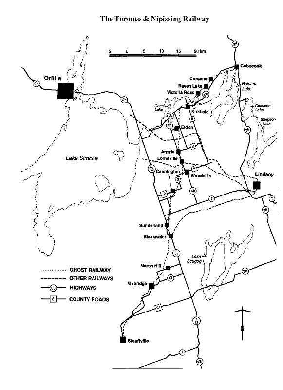 Background Before the Railway Age, travel and the movement of goods in Upper Canada were dependent on waterways, and to some extent on such trails that passed for roads. In 1849 and 1851, the Province of Canada passed loan interest and gauge legislation that triggered Canada’s railway building boom. To obtain financial benefits, a railway had to be built to the “broad” or “Provincial” 5’6” gauge. During this “broad gauge” era of railway development in Upper Canada from 1850 to 1870, one George Laidlaw rose to prominence as an advocate of the economics of the narrow gauge. An emigrant from Scotland, he obtained a position with the Toronto distillery firm of Gooderham & Worts, and persuaded his employers to invest in the narrow gauge concept in sponsoring feeder lines for their business. Accordingly on March 4, 1868, the Toronto & Nipissing Ry (T&N) was chartered “to build from Toronto to a point on Lake Nipissing etc.” with a 3’ 6” gauge. The objects were threefold: (1) to provide a pipeline of grain to the distillery (2) to break the firewood monopoly of Toronto’s existing development road, the Northern Railway of Canada (3) to reach the proposed CPR transcontinental railway somewhere around Lake Nipissing. The T&N at first succeeded brilliantly at the first two objects, but failed miserably on the third, only reaching the first planned segment to Coboconk (the next segment was going to be the tough one through the Halliburton Highlands). The first sod was turned at Cannington on October 16, 1869 with Sir John Sandfield Macdonald, then Premier of Ontario, presiding. (The spade was preserved at the then Victoria Museum, Lindsay, Ont.) The T&N’s charter was amended in 1869 to include an option to build via Lindsay and Fenelon Falls, which was never taken up. (In 1876 the T&N also ratified an agreement to operate the Lake Simcoe Jct. Ry, a branch from Stouffville to Jackson’s Point, opened in 1877.) The Railway The T&N opened officially at Uxbridge on September 14, 1871, entered Victoria County between Cannington and Woodville, and opened to Coboconk on November 28, 1872. The railway was an instant success, carrying grain from all points north to Uxbridge and firewood from all along the line into the City. Its promotion had been well-organized by George Laidlaw, and it had the good fortune to have a very able chief engineer in Edmund Wragge, and likewise in John Shedden, an able president from 1870 to his untimely death at Cannington in 1873. Shedden had good connections with the Grand Trunk Railway (GTR), and elsewhere as a contractor and businessman, and he understood the workings of railways. His GTR connections undoubtedly facilitated the third rail that the T&N needed to get from its Toronto terminus at Beverly St. (next to the distillery) to Scarborough Jct. on the GTR right-of-way, at that time on the 5’ 6” gauge (soon to be converted to 4’ 8½ “). His death was the first misfortune to befall the T&N. By 1873, the T&N owned 12 locomotives, including a Fairlie-patent double-boilered locomotive with a very low-slung centre of gravity and prodigious hauling power for a narrow gauge engine. (It was named Shedden in honour of the railway’s president. There were only two of them in the Province of Canada and they were widely reported as curiosities and marvels of the mechanical age.) Even with this engine, the railway could not keep up with the volume of traffic, as complaints about the backlog of firewood waiting to be carried to Toronto started to mount. The T&N’s second misfortune was the worsening economic climate of the 1870s, with the result that, as with neighbouring railways, traffic receipts started to fall at the same time as the light narrow gauge rails and other infrastructure were starting to wear out on account of the heavy volume of traffic in the early years of operation. The T&N’s third misfortune proved to be the very feature that had sold it in the first place. By 1873 its connecting GTR neighbour to the south had converted to the standard 4’ 8½” gauge, and by 1874 its bi-secting neighbour at Lorneville Jct., the Midland Ry, had followed suit. This left the T&N in a “double whammy” situation where its narrow gauge could no longer cope with the volume of traffic, and the increasing traffic to be forwarded beyond its borders continued to have to be unloaded and reloaded. The T&N simply could not afford to re-gauge, and thus it was taken over and re-gauged to the standard gauge by the Midland Ry in 1881 in exchange for its purchase. Thus died the Gooderham dream of reaching the transcontinental CPR, and the railway remained at Coboconk. Once acquired by the Midland, a connection was made from Wick (Blackwater) Jct. to connect with the even more destitute Whitby, Port Perry & Lindsay Ry near Manilla. For the next 80 years the segment of the former T&N south of Blackwater Jct. became part of the railway artery from Peterborough via Lindsay to Toronto. The Kirkfield Quarry, opened in 1908, also justified the retention of the track north of Blackwater Jct. until the quarry’s closure in 1961. The last “mixed” train from Lindsay to Coboconk ran on March 25, 1955, and the last freight service on March 30, 1965. Of the original T&N stations, only Unionville, Markham and Victoria Road remain (the last altered and converted to a private residence. The original Coboconk station was struck by lightning in August 1908). Abandonments: Stouffville to Zephyr 1928. Sutton to Jackson’s Point 1929. Lorneville Jct. to Coboconk 1965. Woodville to Lorneville Jct. 1966. Zephyr to Sutton 1979. Blackwater Jct. to Woodville 1986. Blackwater Jct. to Uxbridge 1991. © Charles Cooper 2008. All rights reserved. Charles Cooper's Railway Pages |